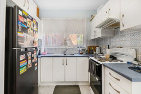 The neat and functional kitchen offers ample bench space and generous cabinetry, with a large window allowing plenty of natural light to fill the space.