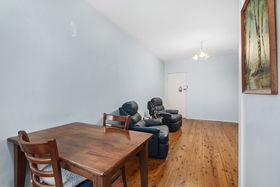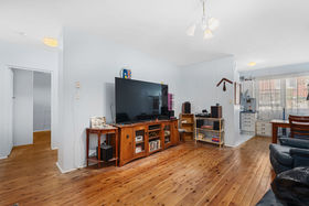 The apartment features a spacious bedroom complete with a large built-in wardrobe with mirrored doors, while the open plan living and dining area provides comfortable everyday living. Timber floorboards flow throughout, complemented by tiled finishes in the kitchen and bathroom.