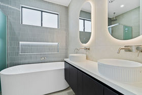 - The luxurious main bathroom features a gorgeous stand alone bath tub and his and her sinks